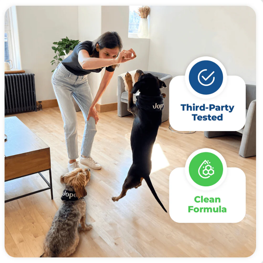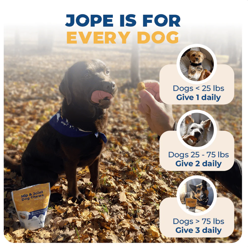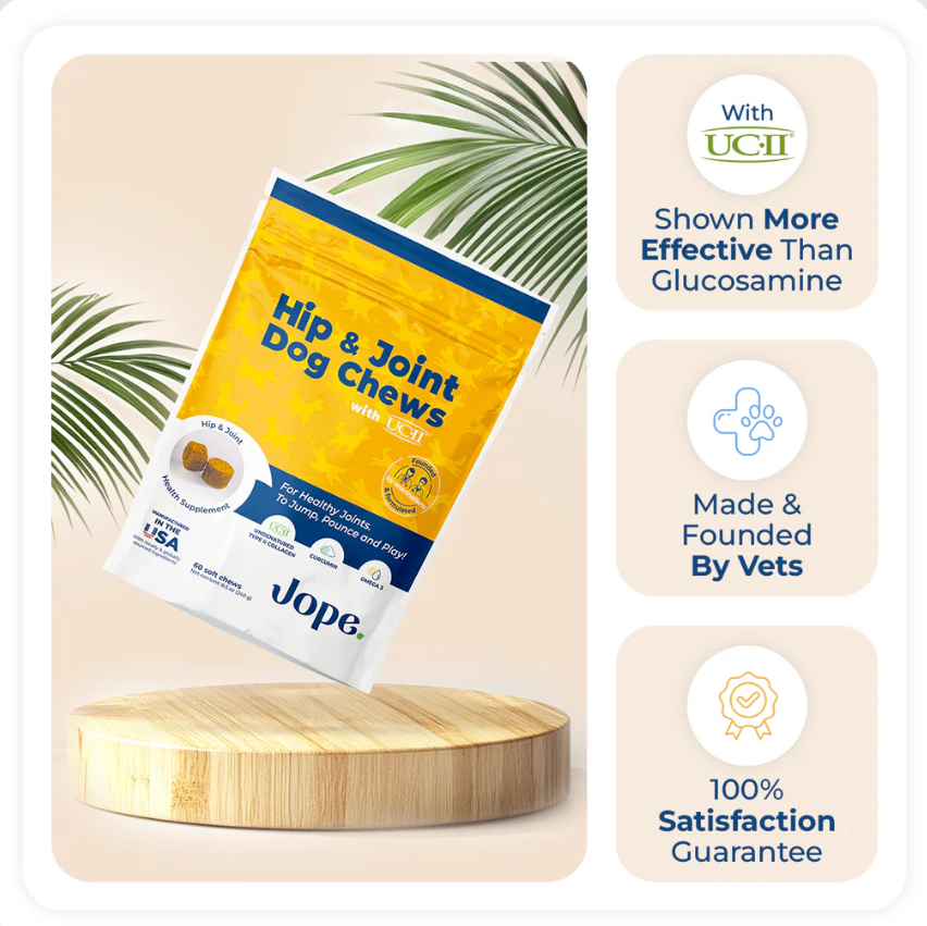 Description: Unleash the power of advanced joint support for your canine companion with Jope Hip & Joint Dog Chews. These veterinarian-approved, supplements are proudly made in the USA and are designed to support your dog's ability to jump, pounce, and play with ease.