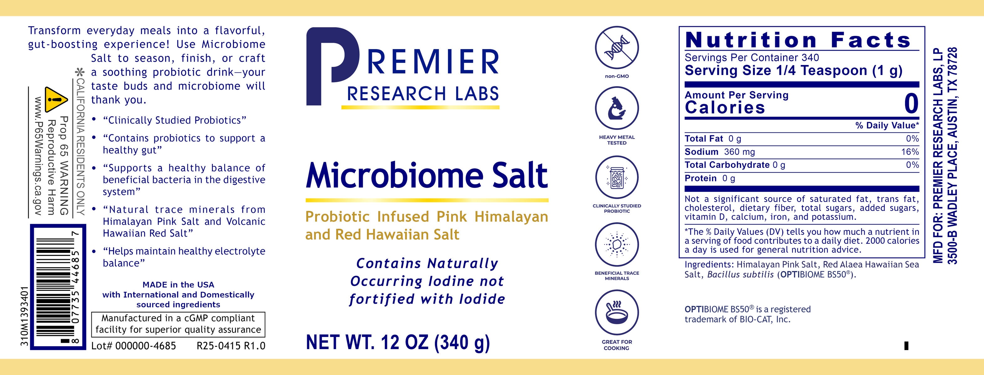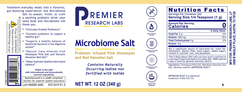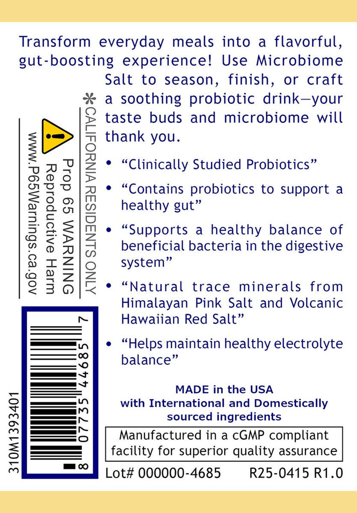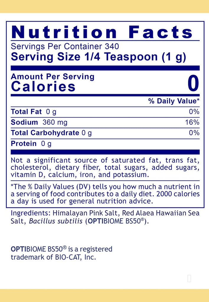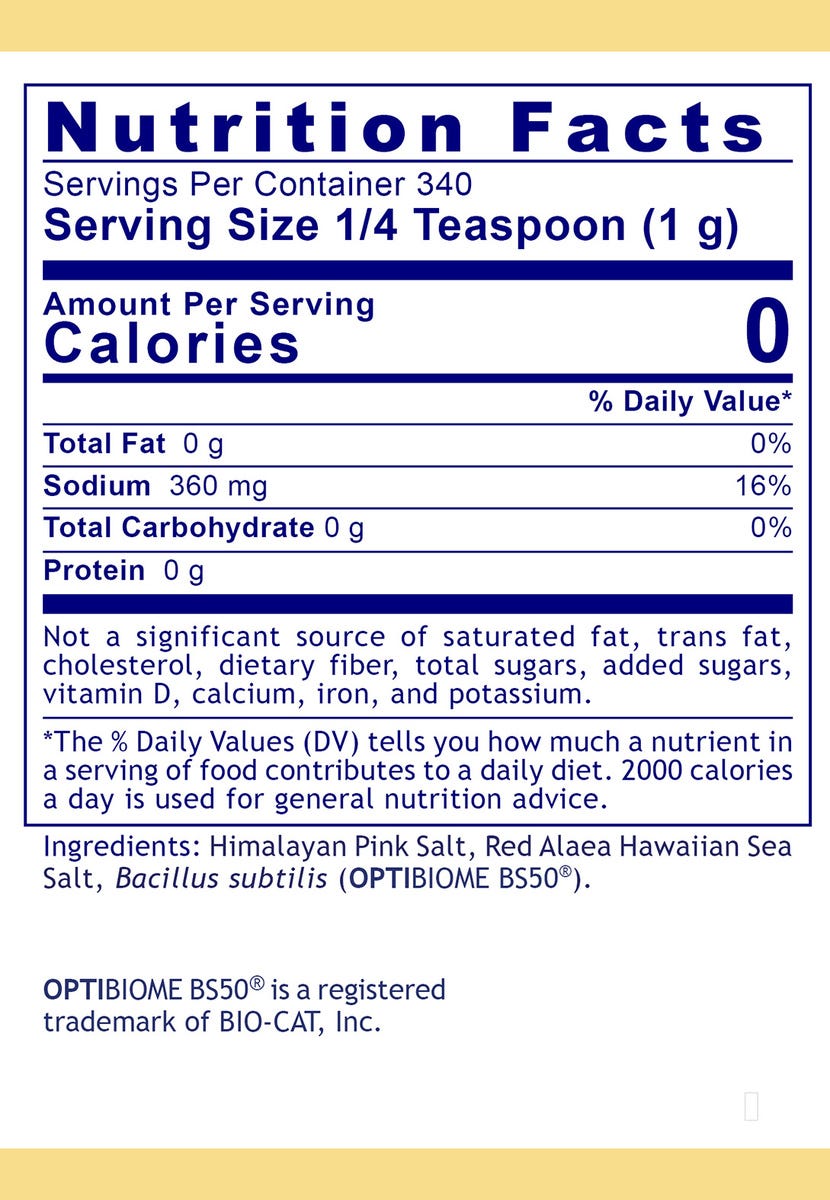 Microbiome Salt is a functional salt blend formulated to support gut and immune health through daily use. * It combines two unrefined, mineral-rich salts (Himalayan Pink Salt and Red Alaea Hawaiian Sea Salt) with BS50®, a clinically studied strain of Bacillus subtilis. This spore-forming probiotic is known for its ability to survive heat, gastric acidity, and long-term storage without refrigeration.