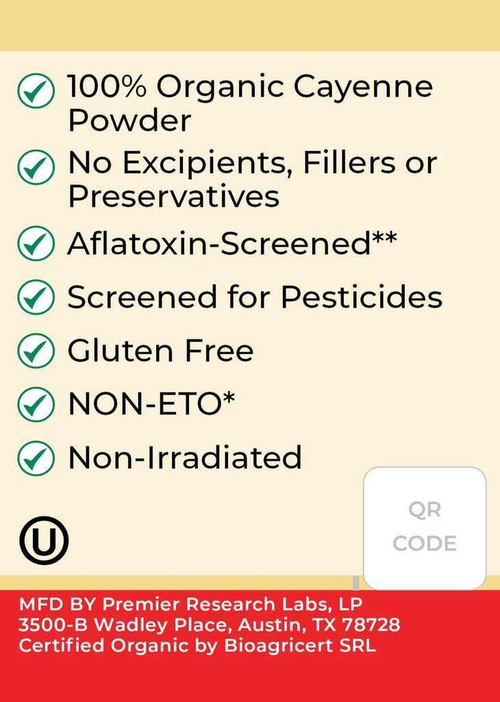 #html-body [data-pb-style=B1TDY6N]{justify-content:flex-start;display:flex;flex-direction:column;background-position:left top;background-size:cover;background-repeat:no-repeat;background-attachment:scroll}Premier Cayenne features organically grown cayenne peppers (Capsicum annuum) that retain their natural capsaicin content for optimal botanical activity. Traditionally valued for promoting healthy circulation, digestive comfort, and metabolic function, cayenne interacts with sensory pathways and has been studied for its thermogenic properties.Unlike many commercial cayenne powders, Premier Cayenne is free from industrial colorants, synthetic additives, and ethylene oxide sterilization. Each batch is third-party tested to confirm identity and ensure it is free from heavy metals, pesticides, aflatoxins, and microbial contaminants.This spice is sourced from verified organic farms and preserves the full-spectrum phytonutrients without harmful residues, offering both culinary flavor and functional health benefits.