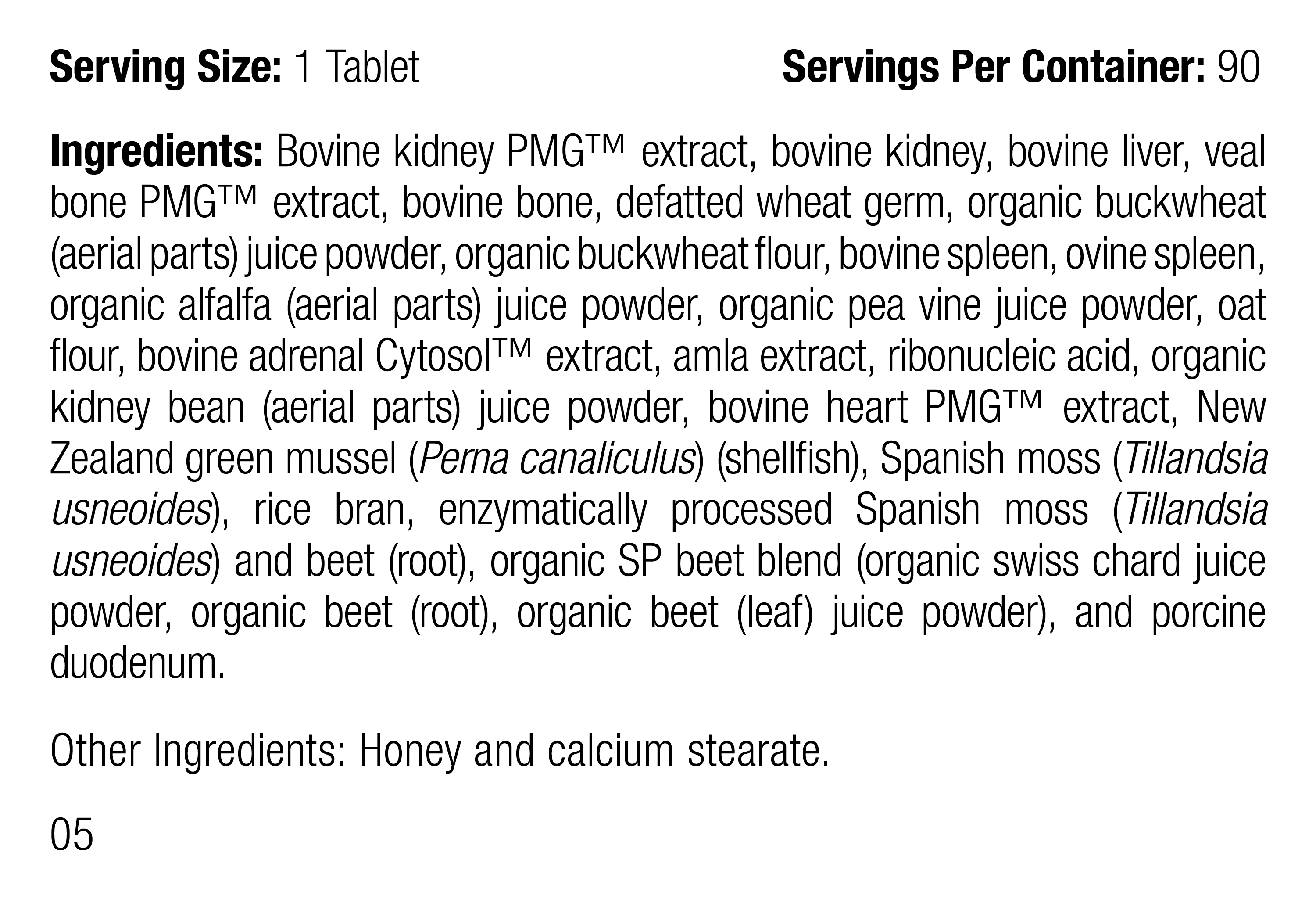 Each Serving Size (1 Tablet) contains: Ingredients: Bovine kidney PMG™ extract, bovine kidney, bovine liver, veal bone PMG™ extract, bovine bone, defatted wheat germ, organic buckwheat (aerial parts) juice powder, organic buckwheat flour, bovine spleen, ovine spleen, organic alfalfa (aerial parts) juice powder, organic pea vine juice powder, oat flour, bovine adrenal Cytosol™ extract, amla extract, ribonucleic acid, organic kidney bean (aerial parts) juice powder, bovine heart PMG™ extract, New Zealand green mussel (Perna canaliculus) (shellfish), Spanish moss (Tillandsia usneoides), rice bran, enzymatically processed Spanish moss (Tillandsia usneoides) and beet (root), organic SP beet blend (organic swiss chard juice powder, organic beet (root), organic beet (leaf) juice powder), and porcine duodenum. Other Ingredients: Honey and calcium stearate.