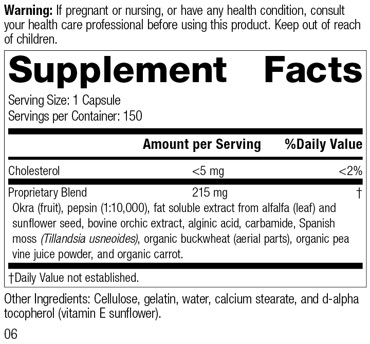 Each Serving Size (1 Capsule) contains: Cholesterol <5 mg. Proprietary Blend 215 mg: Okra (fruit), pepsin (1:10,000), fat soluble extract from alfalfa (leaf) and sunflower seed, bovine orchic extract, alginic acid, carbamide, Spanish moss (Tillandsia usneoides), organic buckwheat (aerial parts), organic pea vine juice powder, and organic carrot. Other Ingredients: Cellulose, gelatin, water, calcium stearate, and d-alpha tocopherol (vitamin E sunflower).